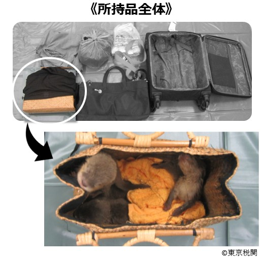 航空機旅客が、キャリーバック内に隠したコツメカワウソ5頭を無許可でタイから日本へ密輸入しようとした事例(2018年10月摘発、逮捕)